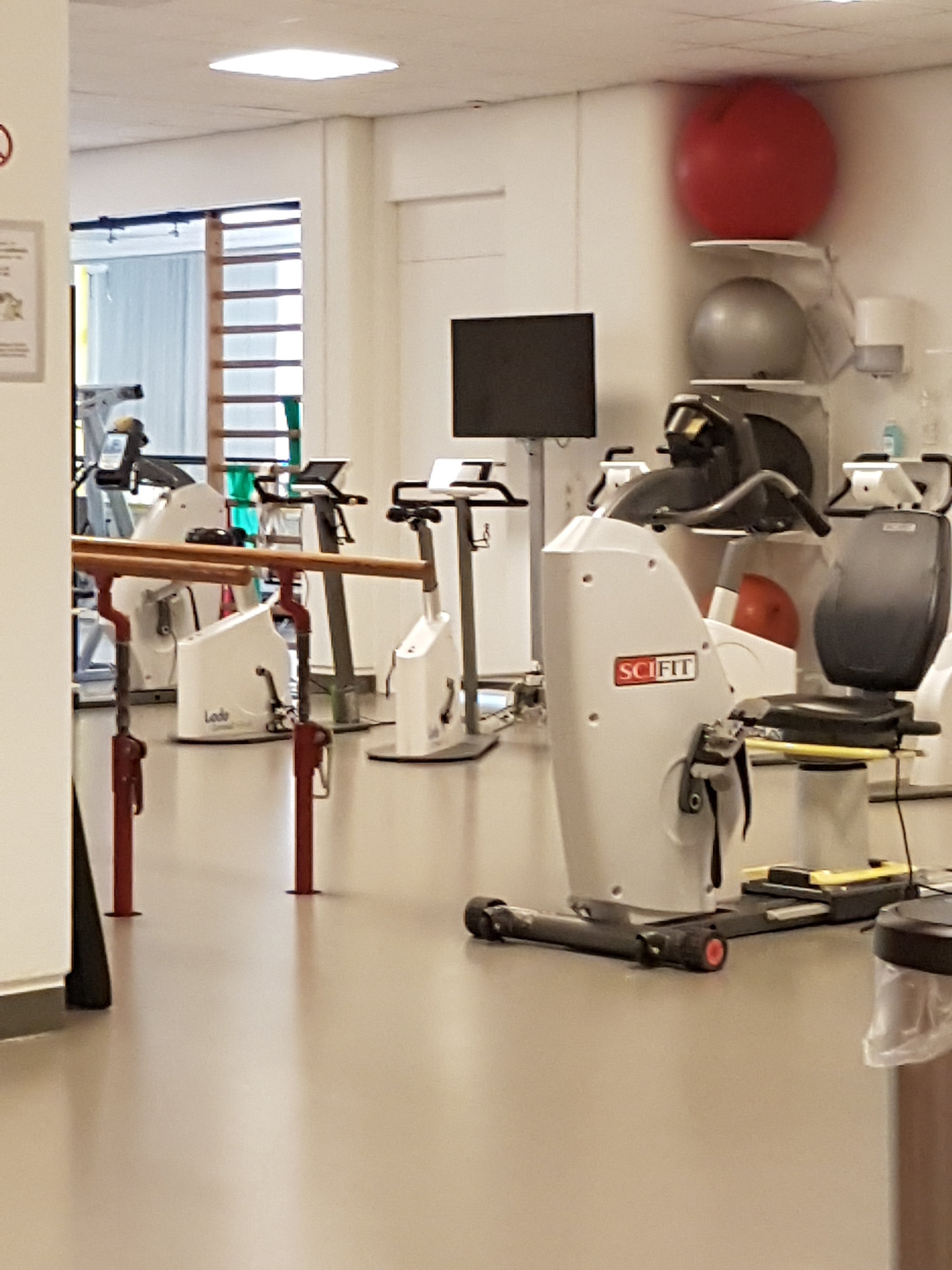 De eerste keer in de trainingszaal waren mijn verwachting hoog. Ik was dan ook zeer teleurgesteld dat ik alleen mocht trainen zonder gewicht, dus alleen met het gewicht van de handels van het fitness apparaat. Nul kilo dus. Maar dit was nodig vanwege de hoge mate van instabiliteit. Elke keer moest ik weer terugschakelen, mijn verwachtingen naar beneden bijstellen en mijn de lat lager leggen. Pas toen mijn handen en met name schouder lichte gewichten aankonden zonder te veel napijn werd ik opgegeven voor sporttherapie en zwemmen. Hier had ik enorm naar uitgekeken want één van mijn doelen was dat ik weer wilde sporten. Het liefst hardlopen. Twee keer in de week kreeg ik sporttherapie en zwemmen. Hoewel, zwemmen mocht ik het niet noemen. Officieel heette het bewegen in het water op mijn rooster. En dat was het dan ook. Ik mocht elegant ronddobberen. Meer niet.