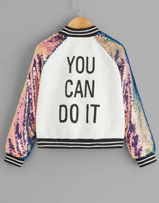 Het toeval wilde dat Charlotte een paar weken daarvoor verliefd was geworden op een bomberjack met pailletten op de mouwen. Het was er echter niet mee in haar maat dus hadden we het voorbij laten gaan. Toen ik later zag dat haar maat weer beschikbaar was, had ik ‘m als verrassing besteld. Die ochtend was het pakketje binnengekomen. Wat zij niet had gezien maar ik wel, was dat er een heel toepasselijke tekst op de achterkant van het jasje stond.