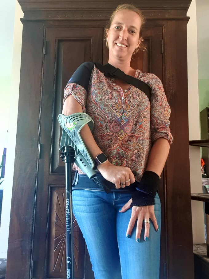 Mijn smartcrutches zijn een andere favoriet. Doordat de hoek van de armsteun op verschillende manieren ingesteld kan worden, kan ik ze ondanks mijn instabiele schouders toch altijd gebruiken. Gelukkig heb ik ze niet altijd nodig. Mijn kinderen vonden ze niet mooi genoeg dus hebben zij ze in een onbewaakt moment versierd met bloemen- en autostickers.